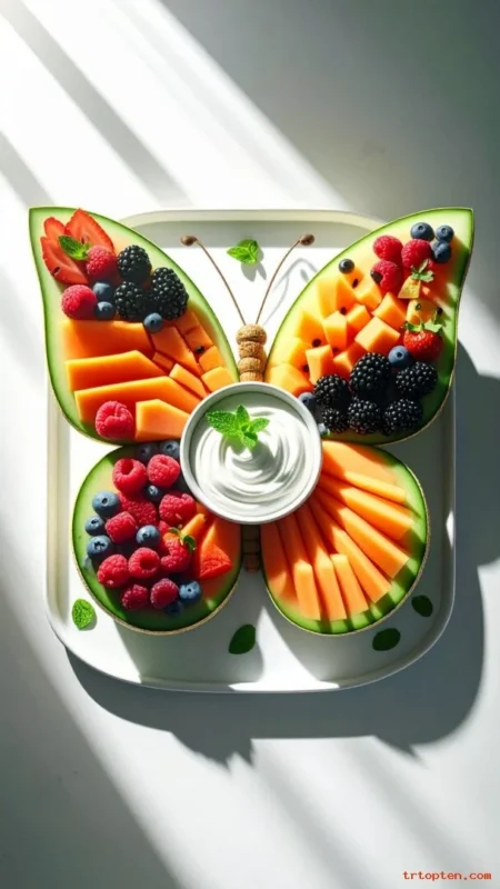 A fruit platter can match the theme with simple shaping. Arrange berries and melon into wing-like sections. Add a small dip bowl in the middle like a butterfly body.