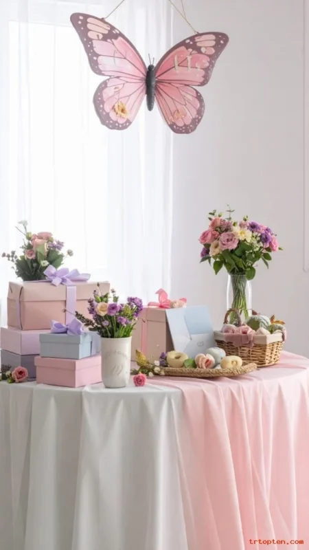 A gift display table helps keep the room organized. Add a sign that says “Gifts” with butterfly corners. Place a basket for cards and a spot for larger packages.
