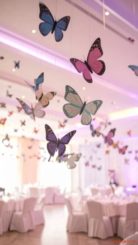 Ceiling decor makes the space feel magical without taking table space. Hang butterflies on clear fishing line so they look like they float. Cluster them over the gift table or seating area.