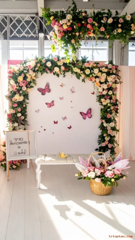 Start with a base like fabric or a simple panel. Add balloons, butterflies, and a small floral cluster for depth. Place the backdrop behind the dessert table or photo area.