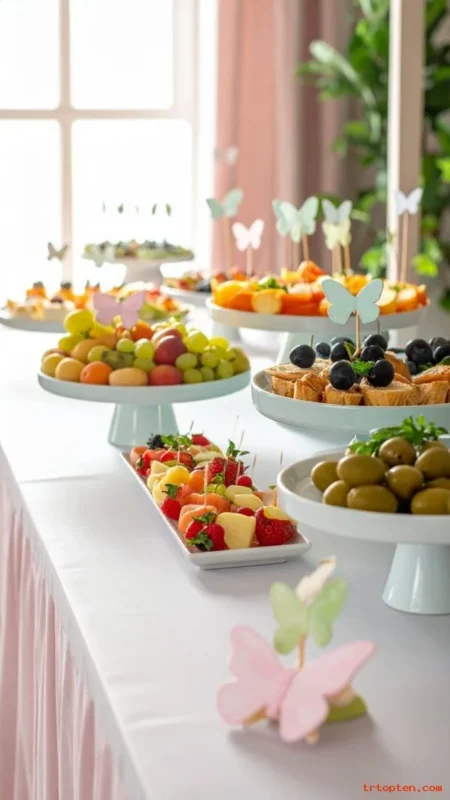 Fresh fruit, mini sandwiches, and pastel desserts match the vibe. Add labels with butterfly icons to tie everything together. Use floral garnishes like edible flowers when possible.