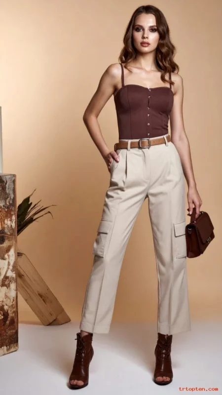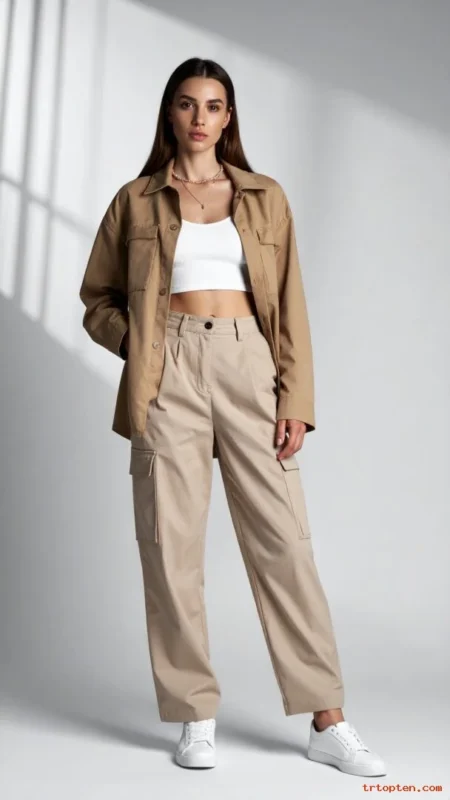 Choose cargos with a smooth fit and fewer straps. Pick a top in the same tone for easy coordination.