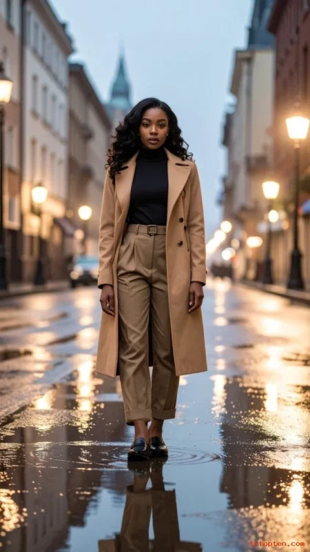 Choose cargos in beige, stone, or taupe for a calm palette. Pick a trench with a belt for waist definition.
