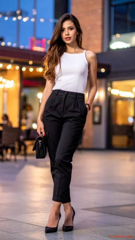A black tank top with beige cargo pants looks sleek and balanced. The contrast helps the outfit feel intentional.