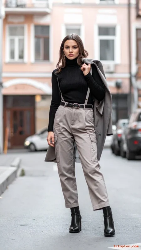 A turtleneck with cargo pants looks sleek and clean. It works well for cool weather and simple layering.