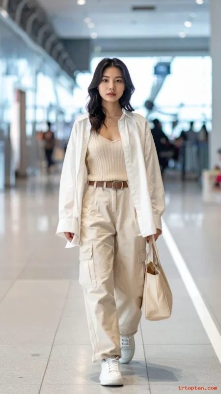 An oversized button-up with cargo pants looks relaxed and stylish. It works for travel days and casual offices.