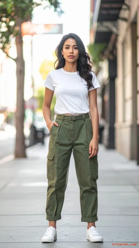 A crisp white tee and olive cargo pants create a clean base that feels fresh. You get an outfit that looks effortless and still sharp.