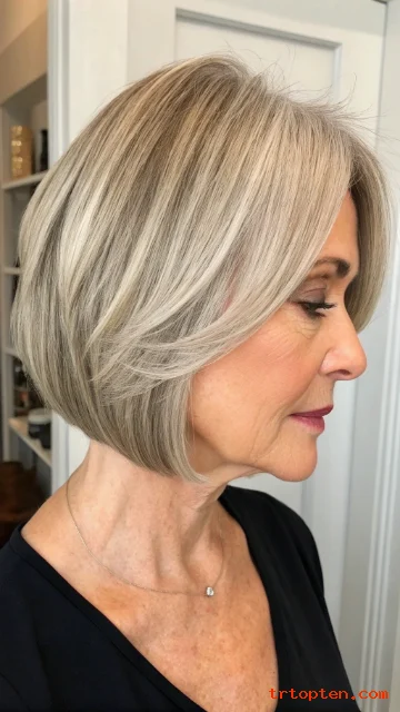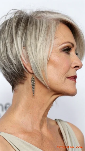 Keep the cut precise with regular trims every few weeks. Use a purple shampoo to keep gray tones bright and free of yellow. You will look radiant and strong.