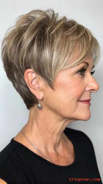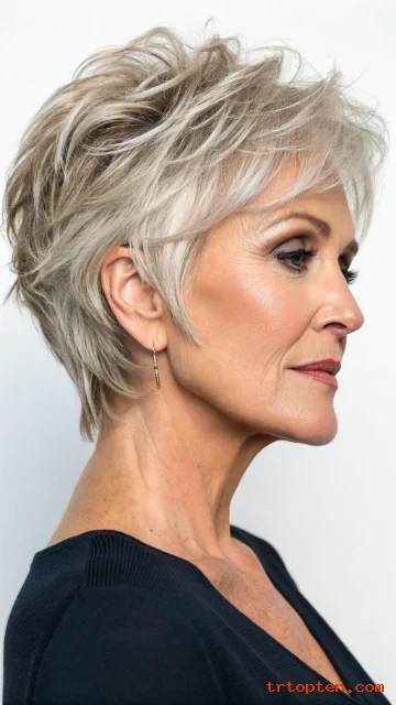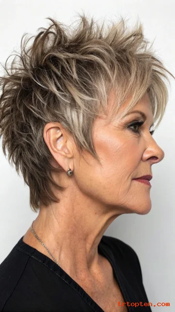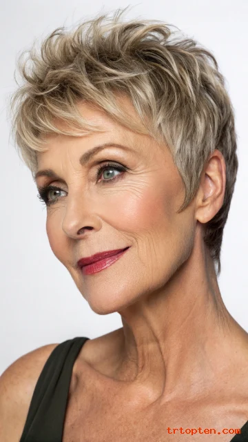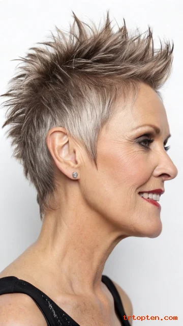A layered pixie with a spiky top introduces fun and personality. The crown area is cut shorter and layered to allow hair to stand up. This creates height and a playful, textured effect on top. The sides and back are usually cut shorter and closer to the head. The contrast is dynamic and eye-catching.