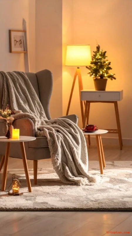 Turn one corner into a holiday reading spot with a chair, throw, and small lighted tree. This creates a quiet cozy zone.