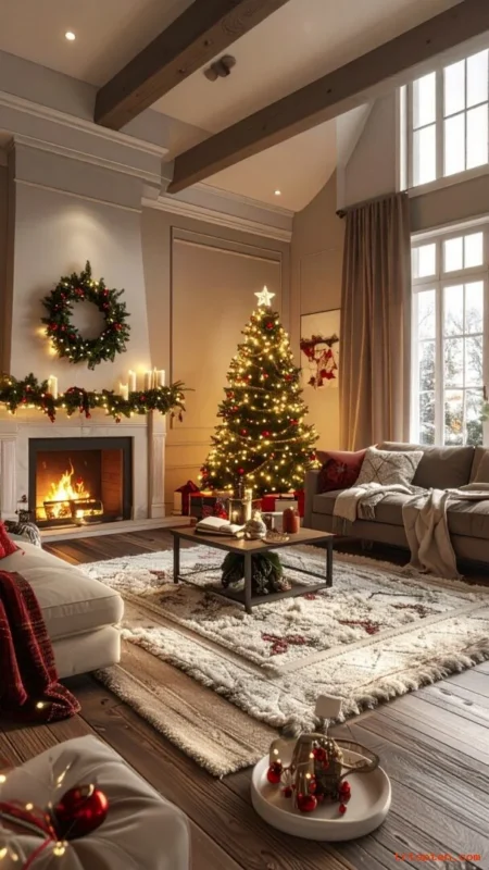 Choose a rug with red, green, or neutral holiday tones. Keep patterns simple so the room stays calm.