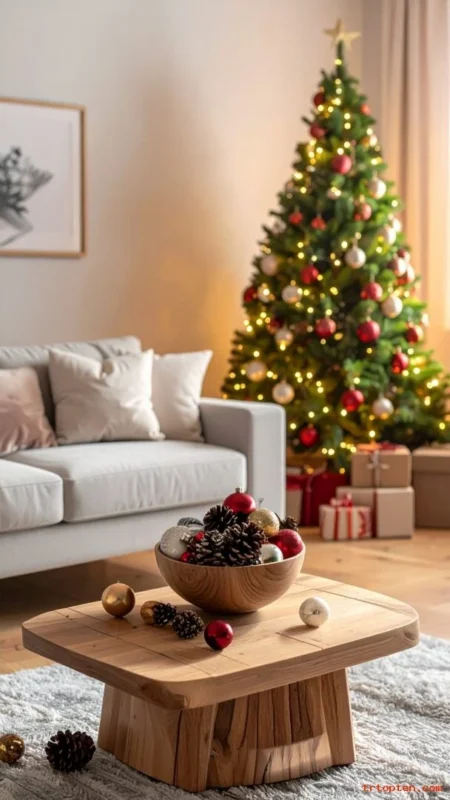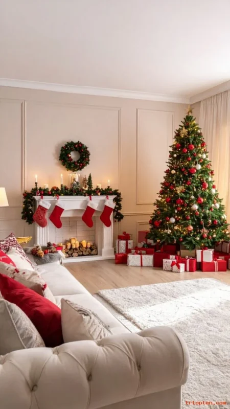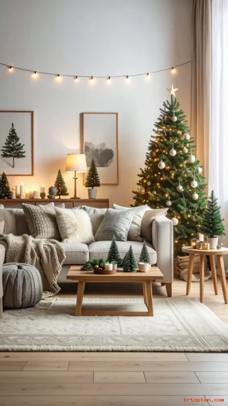 Pick one main color theme like red and green, neutral, or blue and silver. A theme makes the living room look planned.