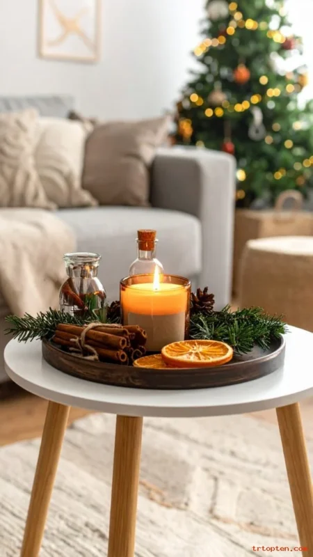 Place a small tray with cinnamon sticks, dried orange slices, and pine sprigs on a side table. This adds decor and a cozy scent.