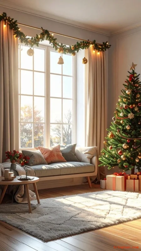 Use small ornaments or bells on the garland for sparkle. Keep the window decor light so it does not block daylight.