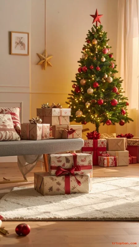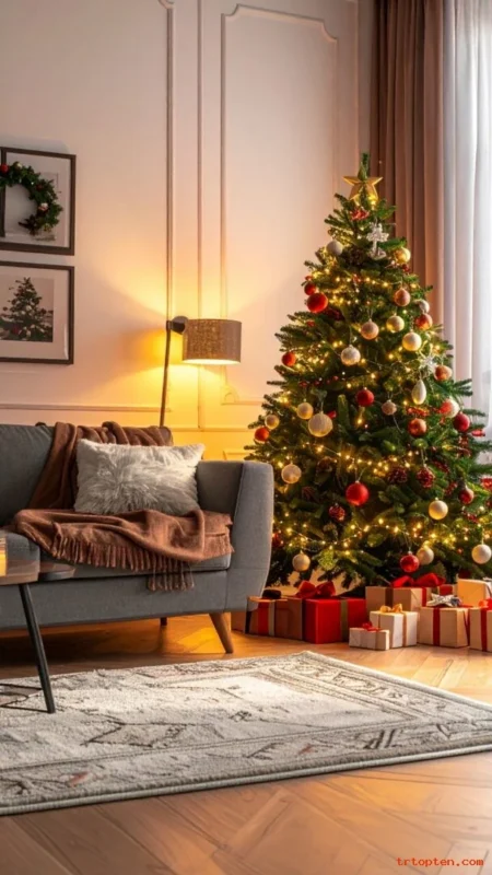 Place the Christmas tree in the room’s main corner so it anchors the space. A well-lit tree acts as the room’s main decoration.