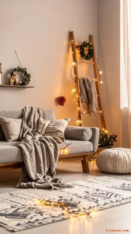 Add a small wreath on the ladder top for a simple finish. Keep the ladder near the sofa for easy use.