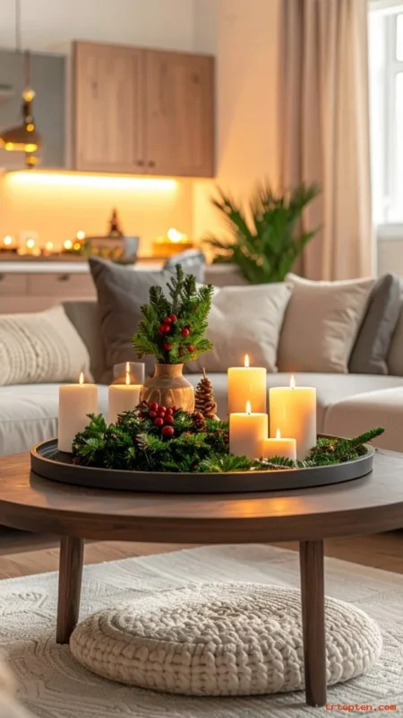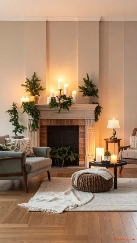 Use pillar candles on the mantel and side tables for warm light. Candlelight makes the living room feel relaxed and festive.