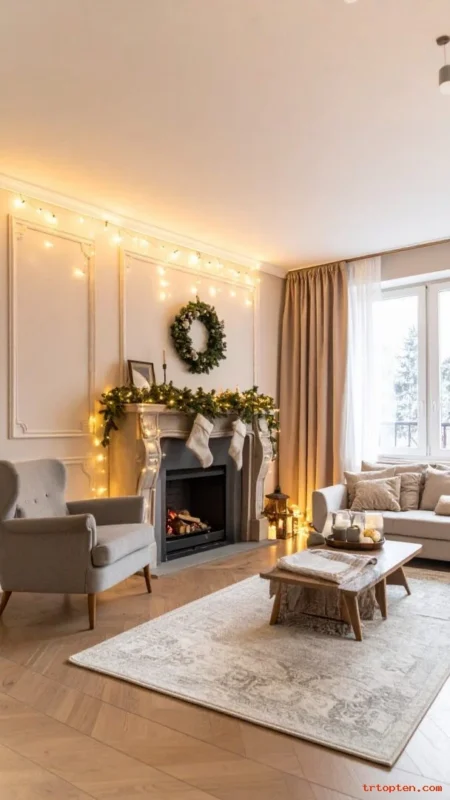 Wrap warm white string lights along a mantel, shelf, or curtain rod for instant glow. The soft light makes the living room feel calm and festive.