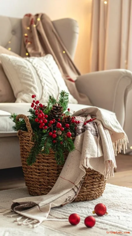 Use neutral textiles so the basket looks calm. Add one plaid item for a holiday touch.