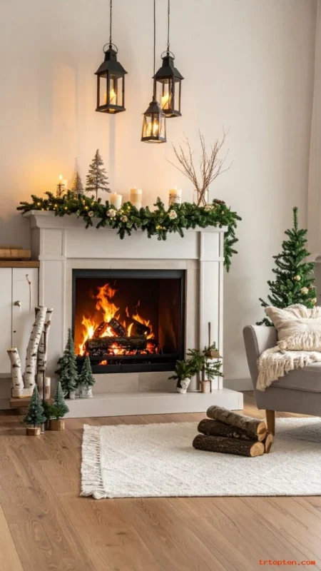 Decorate the hearth with lanterns, birch logs, or small trees. A hearth display adds depth to the fireplace area.