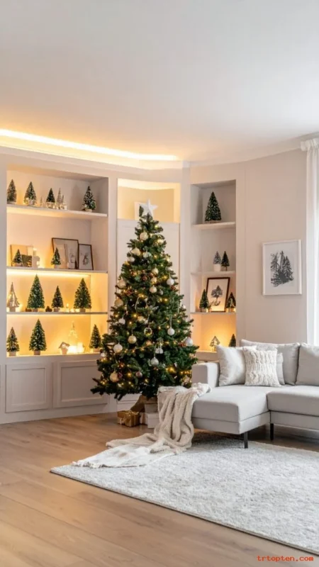 Add small trees, garland, and framed winter prints on built-in shelves. The shelves become part of the holiday scene.