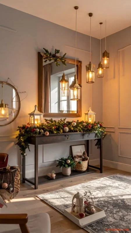 Style a console table with garland, lanterns, and a few ornaments. This adds holiday charm without taking up floor space.