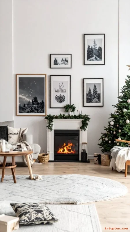 Swap a few frames with winter prints or holiday quotes in a matching style. Wall art adds holiday mood without taking space.