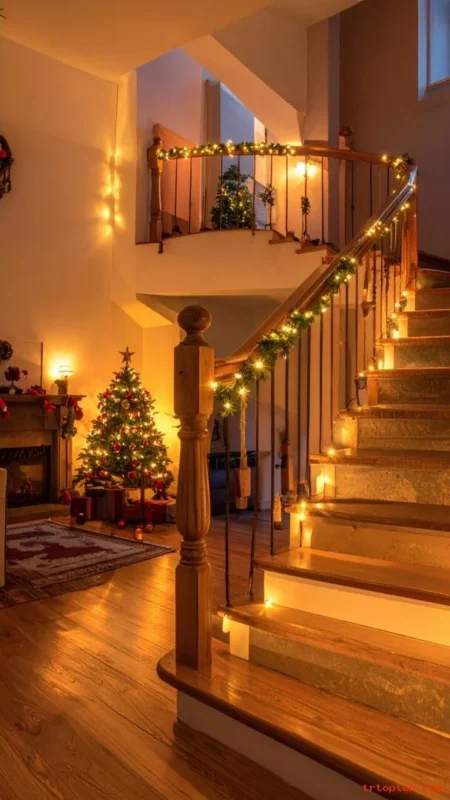 Drape garland along the stair rail to extend the holiday look beyond the tree. This detail makes the whole area feel connected.