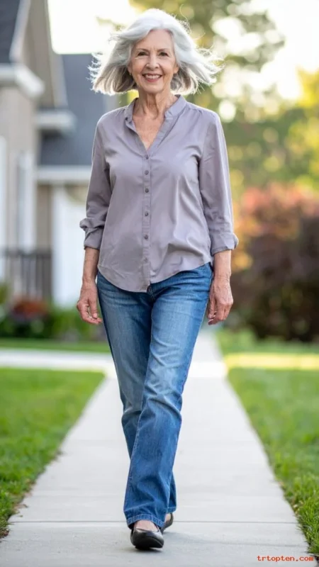 Many women over 70 look great with short to medium lengths that sit between the ears and shoulders. This range keeps hair light, easy to style, and less likely to pull facial features downward.