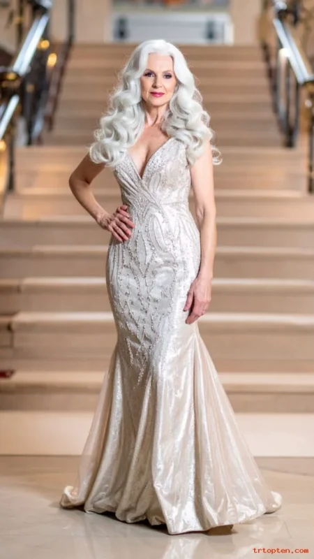 For women over 70, this style feels luxurious and dramatic in the best way. It highlights the natural sheen of silver or white strands.