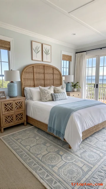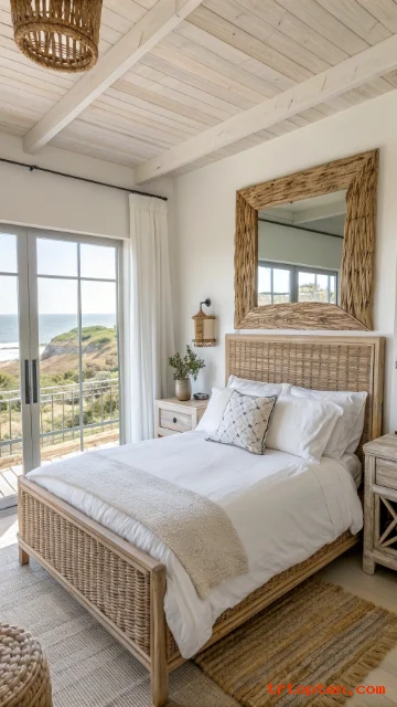 Add a rattan headboard to bring in beach texture right away. It makes the bed a natural focal point without feeling heavy.