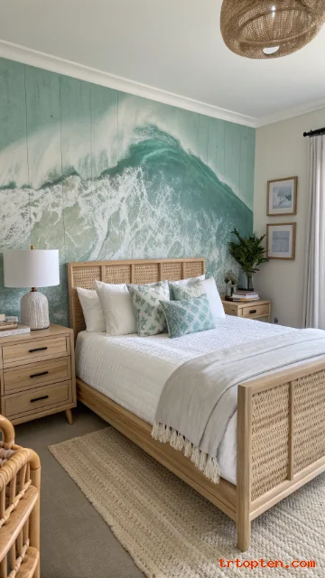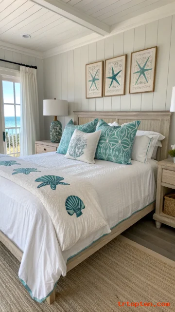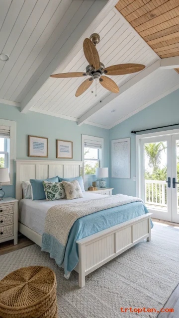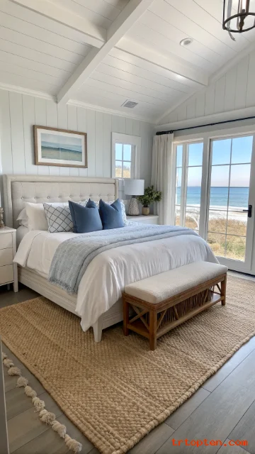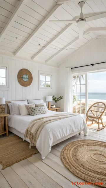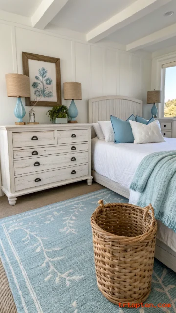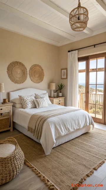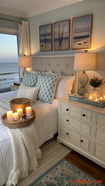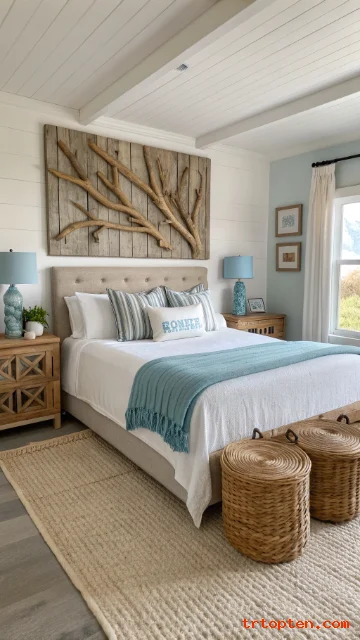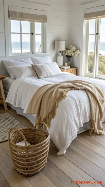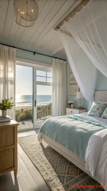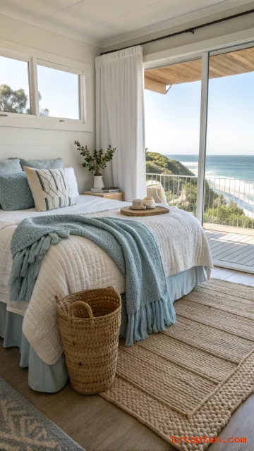 Start with white and sand tones, then add soft blues, woven pieces, and simple ocean-inspired accents. Stick to a clean layout, and your bedroom will feel like a calm coastal escape every day.