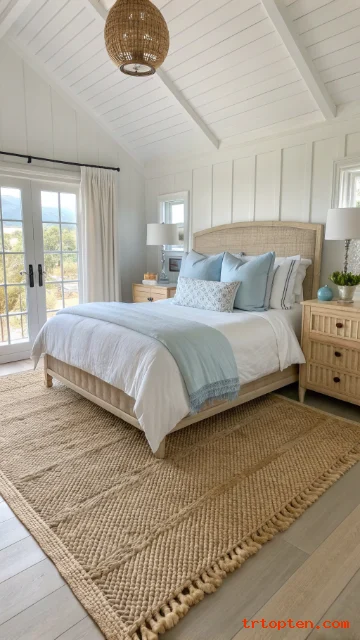 Place a jute rug under the bed for an instant coastal foundation. The natural weave adds texture without loud color.