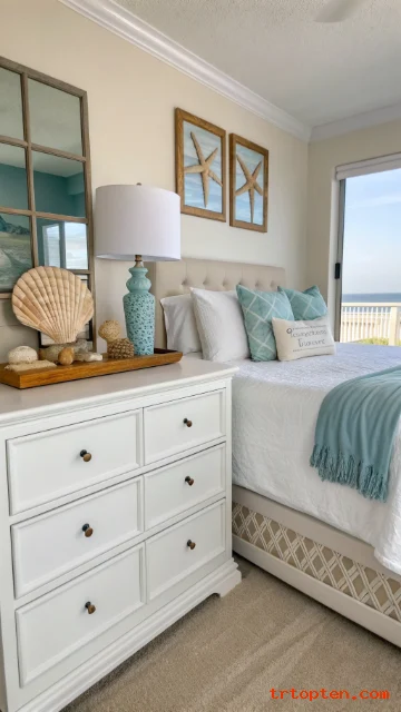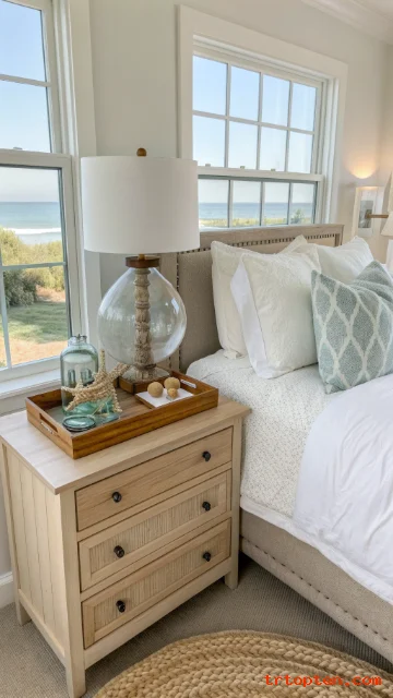 Style your nightstand with a small tray, a lamp, and one coastal detail. This keeps the room neat and easy to maintain.