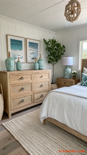 Place ceramic vases in white, blue, or sea glass tones on a dresser or nightstand. Ceramic adds a smooth, beachy texture.