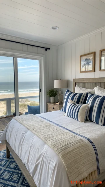 Use thin stripes on pillows, bedding, or a small area rug. Stripes give a classic seaside feel without looking themed.