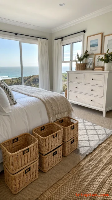 Choose baskets in natural seagrass or rattan tones. Place one by the bed and one near the dresser for a simple system.
