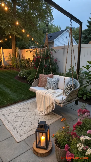 Install a porch swing on a sturdy frame or pergola beam. Use outdoor pillows in soft colors and simple patterns. Add a throw blanket for extra warmth.