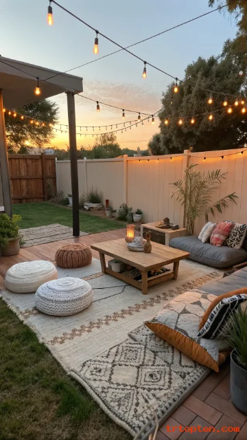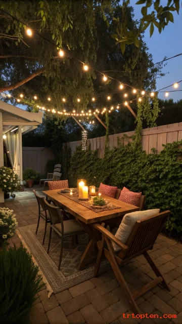 A string light canopy adds glow without harsh brightness. It makes your backyard feel welcoming after sunset. It also pulls attention to the hangout zone.