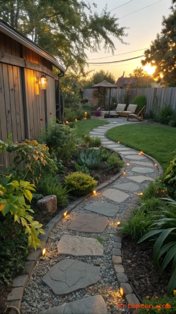 Add a small seating spot at the end of the path. This creates a destination and feels cozy. The yard will feel like a peaceful stroll.