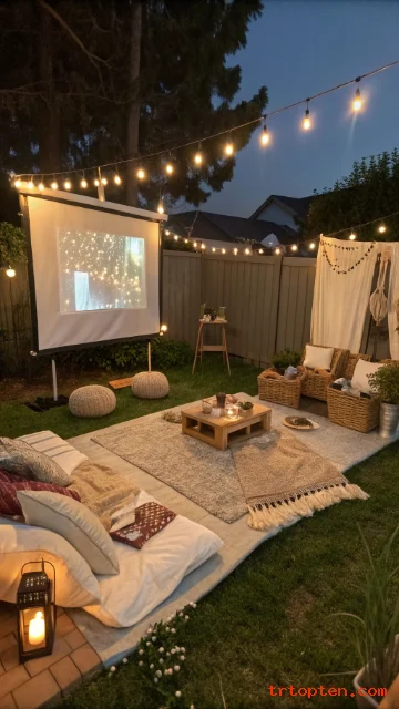 A movie night setup feels cozy and fun. It also gives your backyard a special purpose. You can make it simple with a portable screen.