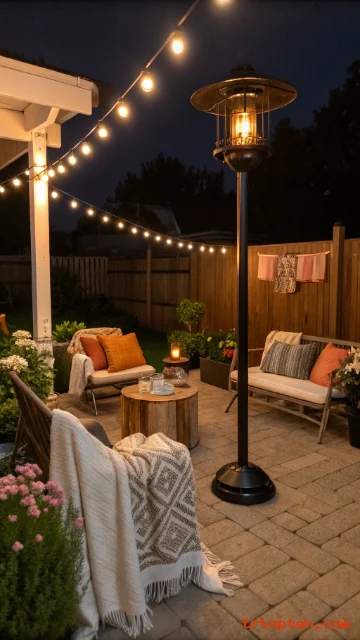 Add soft lighting nearby to balance the heater’s brightness. This keeps the mood calm instead of harsh. Your backyard will feel usable more often.