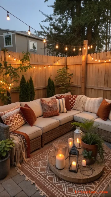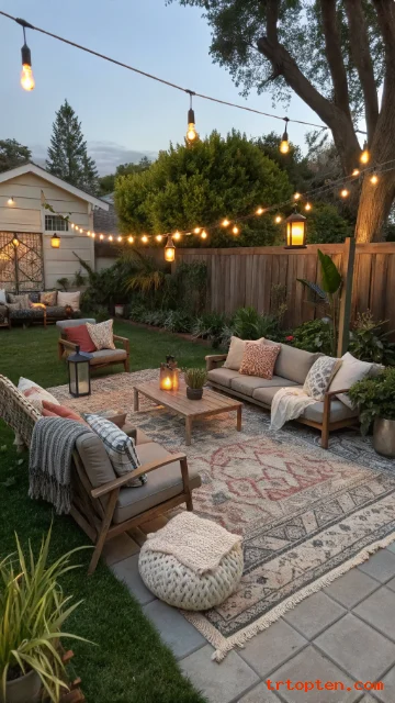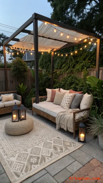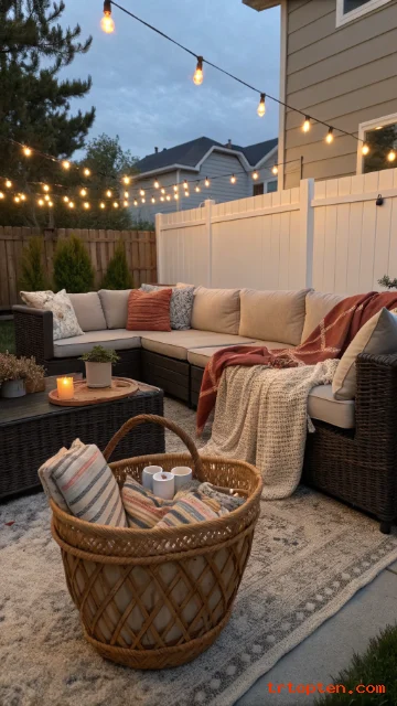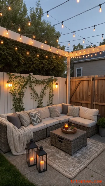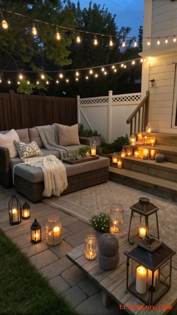 Use one main light source like string lights and add lanterns. Finish with blankets and pillows across seating. This setup feels complete and welcoming.