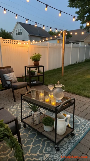 Choose a weather-resistant cart or store it under cover. Keep it stocked with glasses, napkins, and a tray. Add a small plant to soften the look.