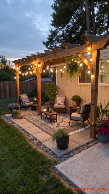 A mini pergola gives structure without taking over the yard. It also helps you create a cozy zone. Even a small one changes the whole feel.