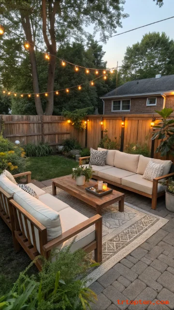 Start with string lights, a rug, and pillows. Add a fire bowl or lanterns for warm light. Use planters to define a cozy seating zone.