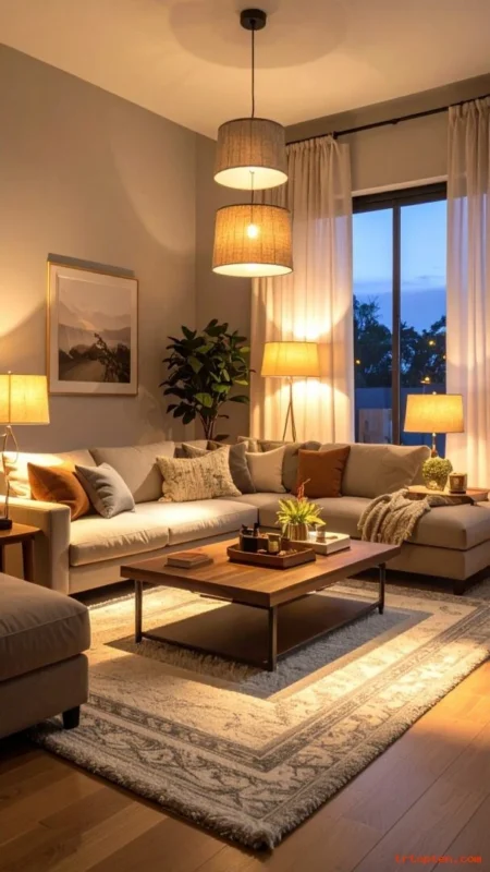 Add table lamps, a floor lamp, and a small accent lamp to spread light evenly. Warm bulbs make the room feel softer than one bright ceiling light.