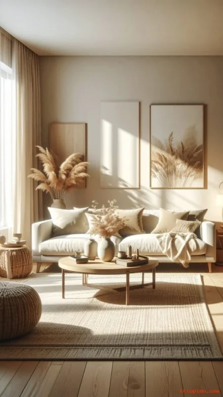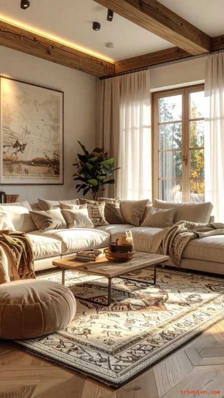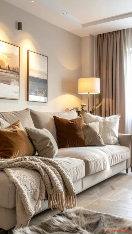 Start with cream walls or warm greige, then add beige, tan, and soft brown accents. Use black sparingly for contrast and definition. Mix matte and textured finishes to avoid a flat look. Keep the palette steady across pillows, rugs, and curtains.