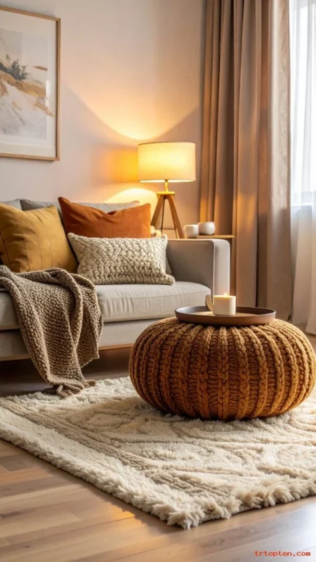 Choose a knit pouf, a velvet ottoman, or a leather pouf depending on your style. Place it near the sofa so it works as a footrest. Top it with a tray when you need an extra surface. This keeps the pouf useful every day.