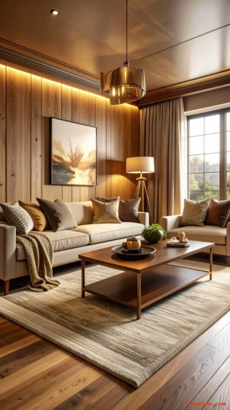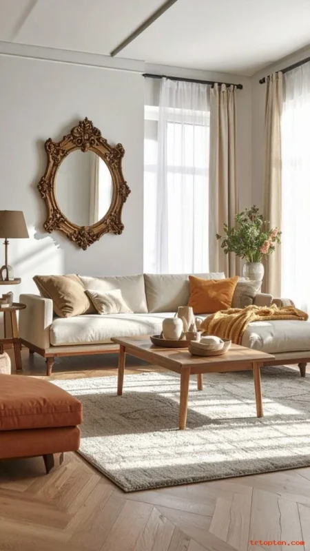 Use a brass floor lamp, bronze picture frames, or warm gold candle holders. Keep metal finishes consistent across the room. Mix metals with wood and textiles so it feels soft. Avoid too many shiny items so the look stays calm.